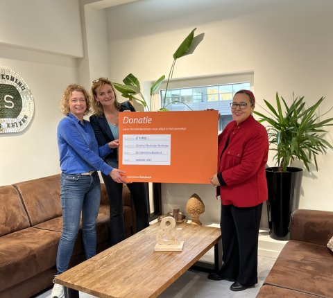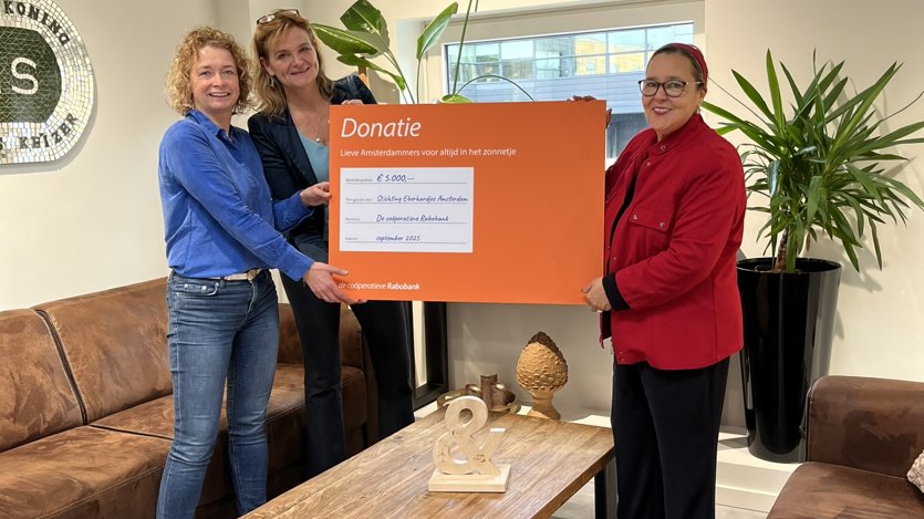 Dinsdag 28 oktober ontvingen wij uit handen van Rahma el Mouden een symbolische cheque van €5.000. Afgelopen zomer had Rabobank Amsterdam deze mooie gift al aan ons overgemaakt, als aanmoediging om te blijven focussen op het goede. Door omstandigheden konden we de cheque pas nu ophalen, maar daardoor ontmoetten we ook Rahma. Dat bleek een extra cadeau.